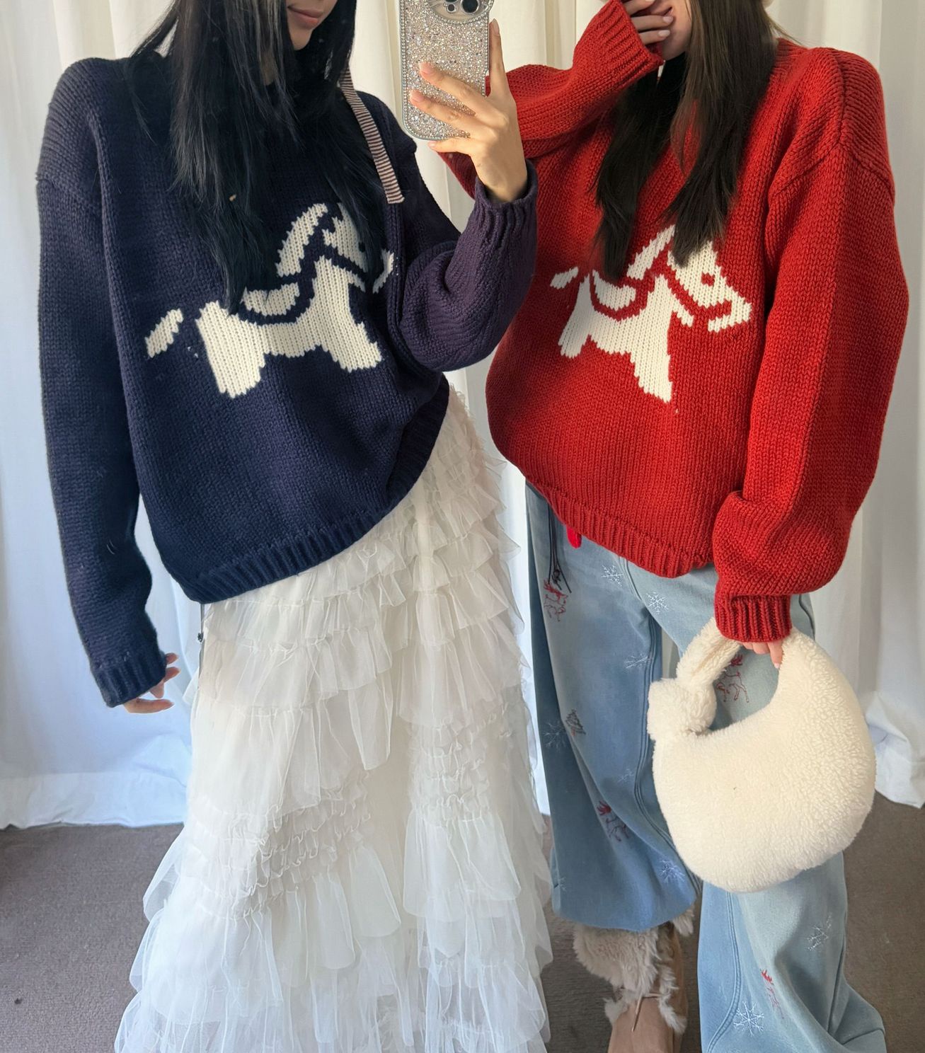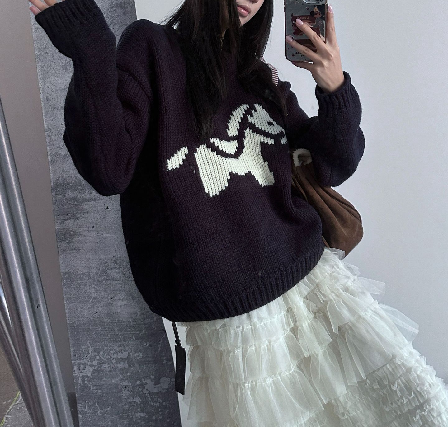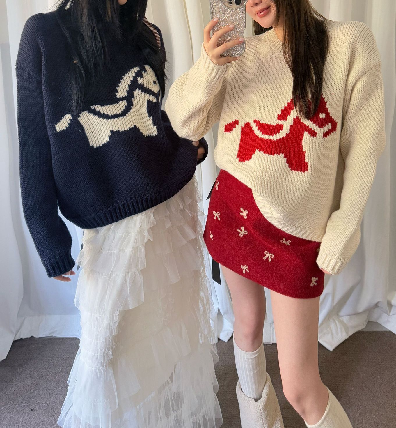 設計感撞色卡通馬年提花氛圍感針織長袖上衣