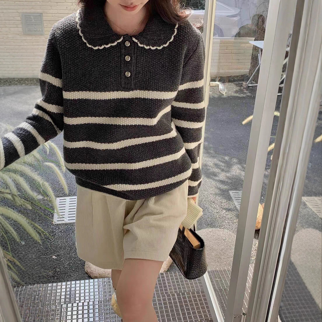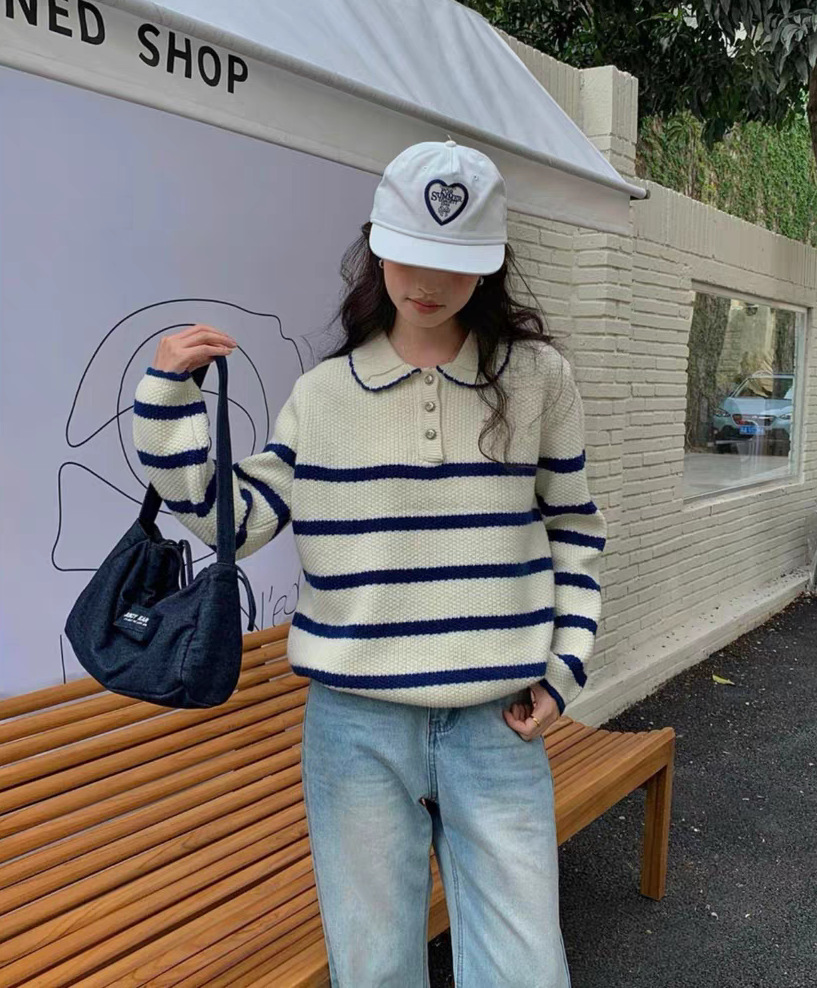 韓系條紋!寬鬆顯瘦百搭娃娃領針織毛衣上衣